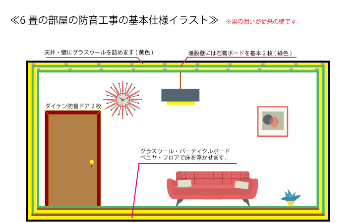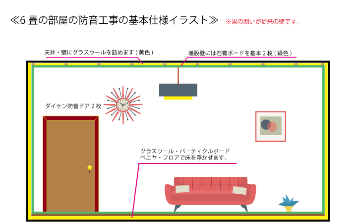 しかし、そこまでにこだわらずに、最低限の事(吸音・遮音)やルームチューニングを行うだけでは 高額になる事はありません。